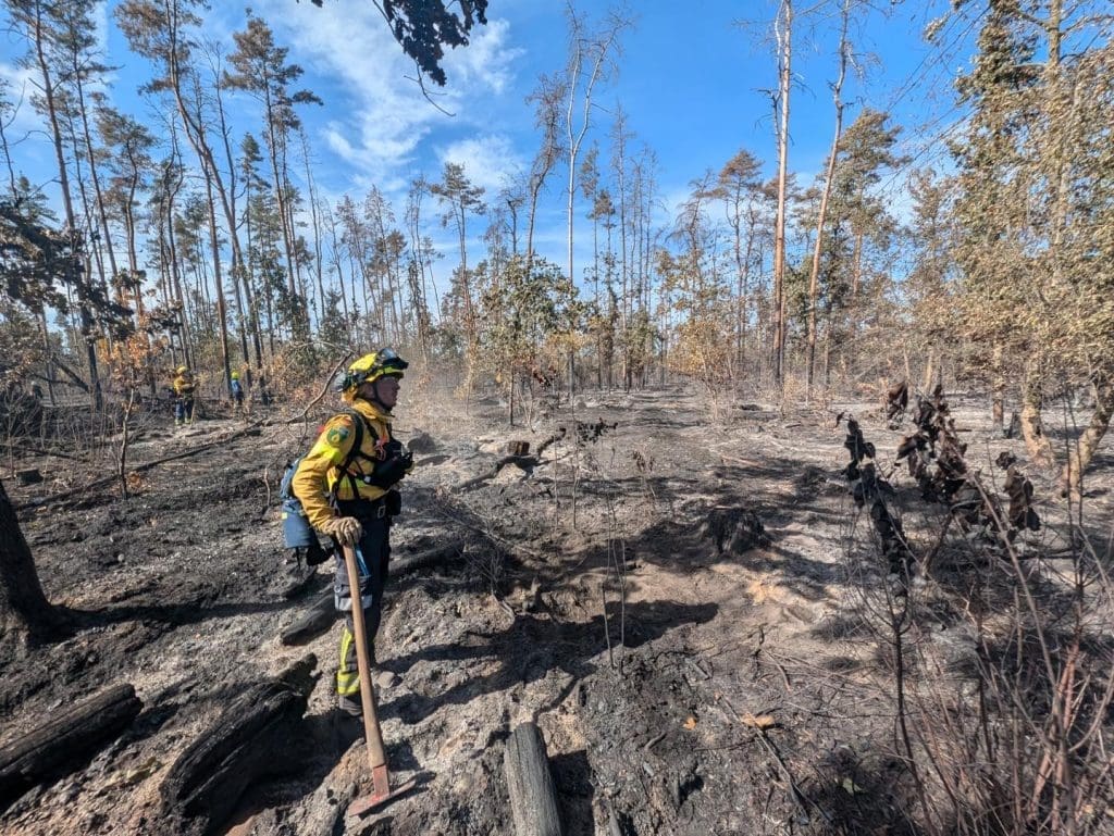 Einsatz in Oranienbaum: Zeitgleich erreichte uns eine Anfrage aus dem Kreis Wittenberg. Der dortige Waldbrand weitete sich massiv aus, sodass @fire rund 40 ehrenamtliche Einsatzkräfte mobilisierte. Neben Fachberatern waren wir mit Handcrews aktiv an der Brandbekämpfung beteiligt. Durch den gezielten Einsatz von Vorfeuern und das Anlegen von Schutzstreifen konnten wir eine weitere Brandausbreitung eindämmen. In enger Abstimmung mit den örtlichen Feuerwehren und mit technischer Unterstützung des Deutschen Zentrums für Luft- und Raumfahrt (DLR) konnten letzte Glutnester aufgespürt und erfolgreich bekämpft werden. Nach zwei intensiven Tagen war der Einsatz in Oranienbaum erfolgreich abgeschlossen.